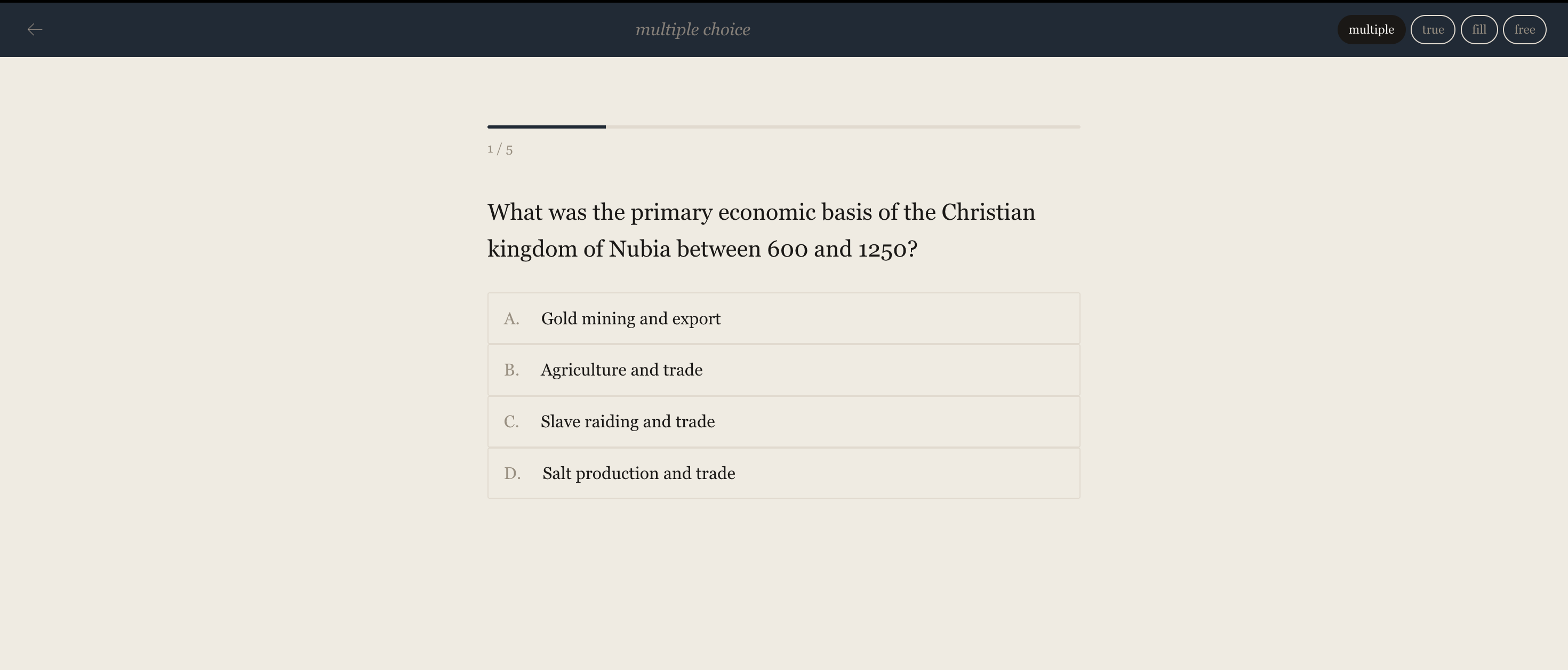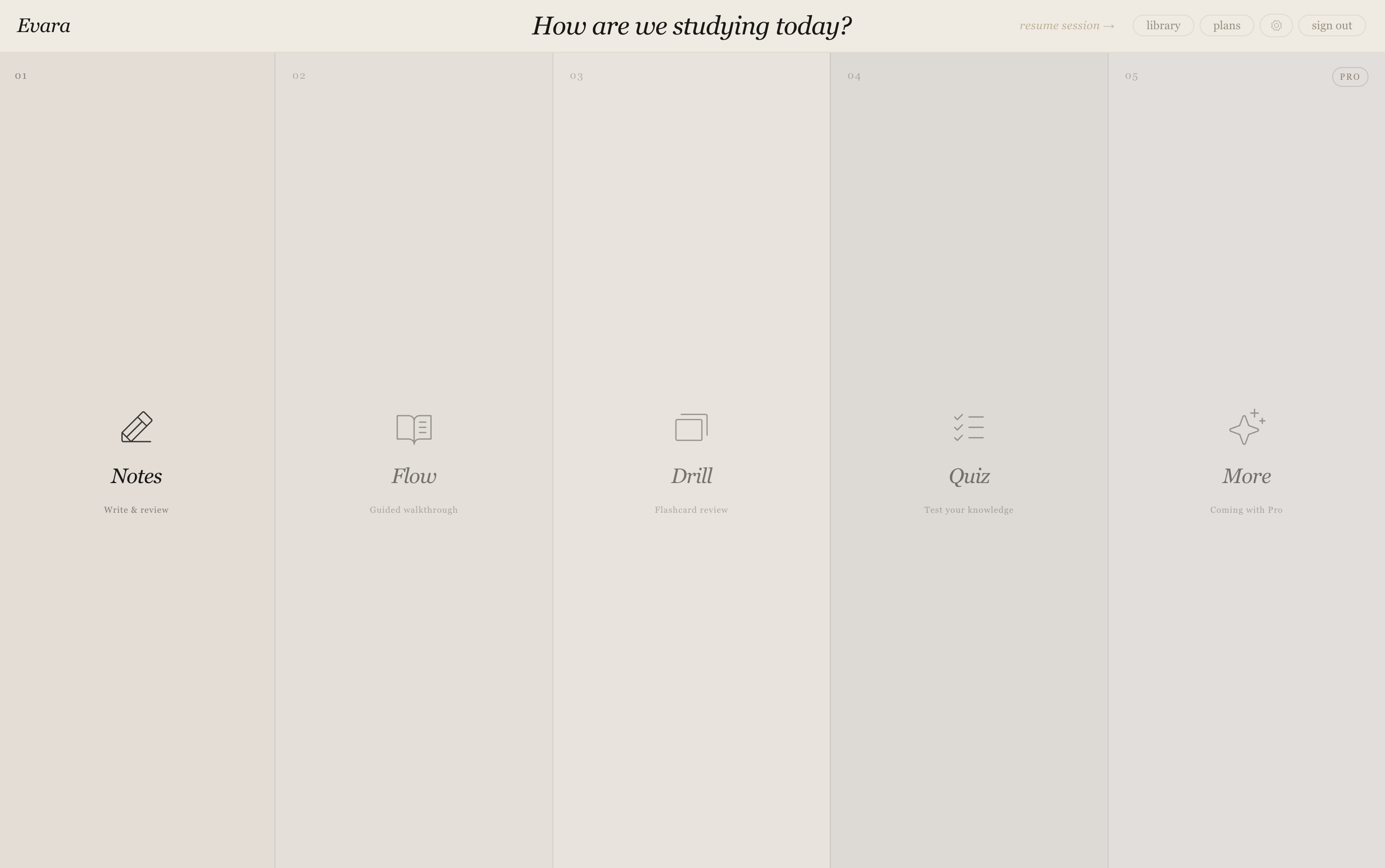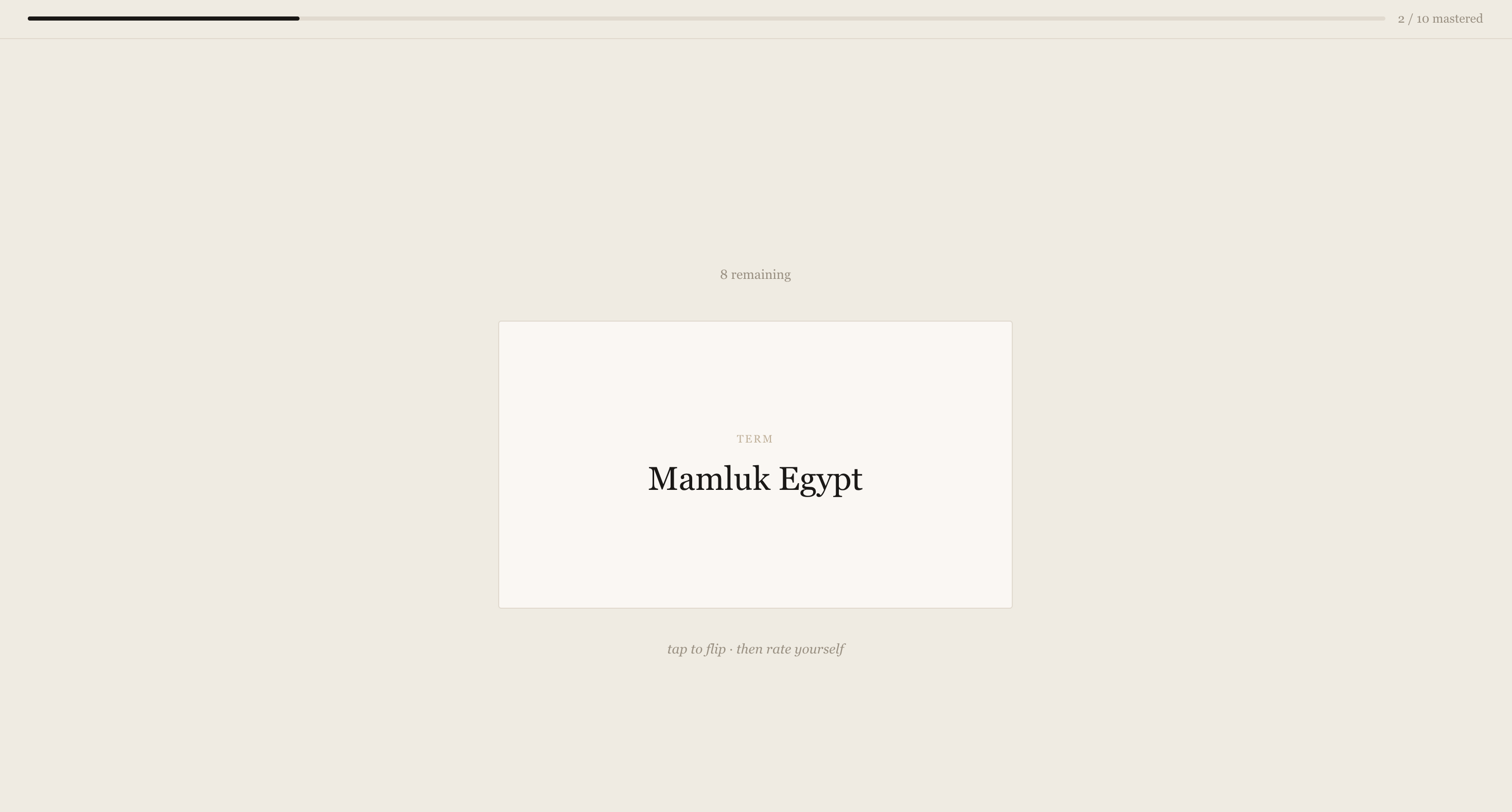 No ads. No streak pressure. No social feed. Just your material, shaped into the form of study that fits the moment.
