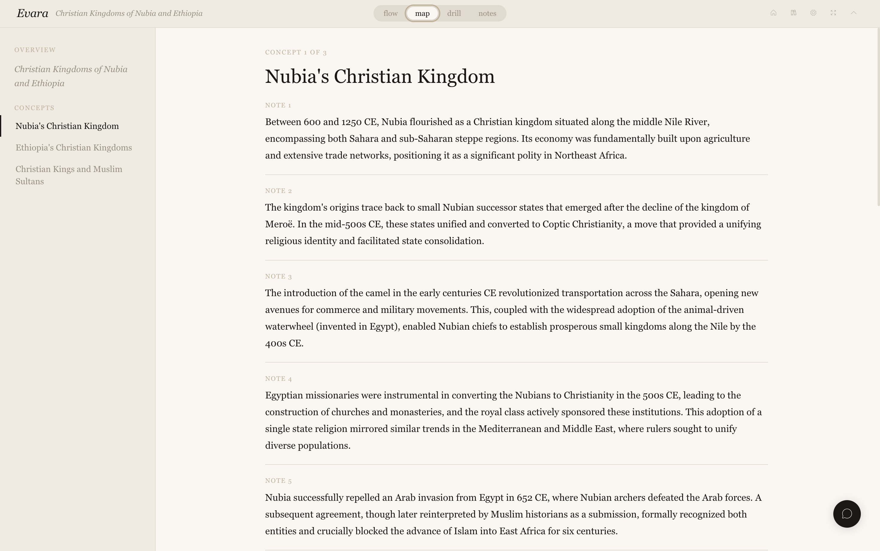 Flow mode walks material in the order your brain processes it. Drill adapts to what you actually missed. Map gives you the view from above.